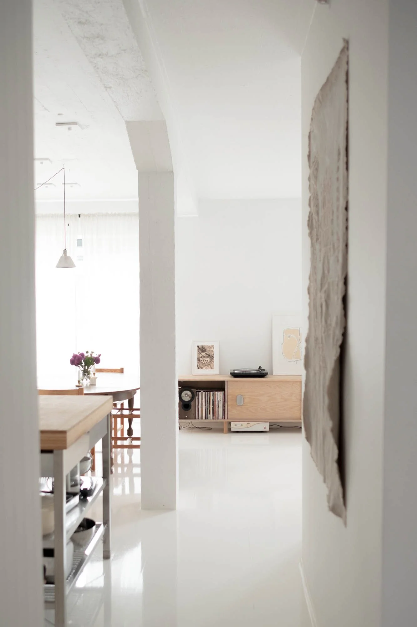In a converted electricity conversion station on a hilly part of central Oslo lies this 70sqm loft. Previously given off the shelf surface materials like yellow parquet and punch-through thin plaster boards, this space was brought back to its original beauty of thick and raw concrete structure. Showing the infrastructure of the pipes and rebar felt historically important to the space. Its residents, an artist and designer needed light and bare walls in order to house their collection of self-made objects. Stainless steel and high-gloss floors reflects the light thought the space.
