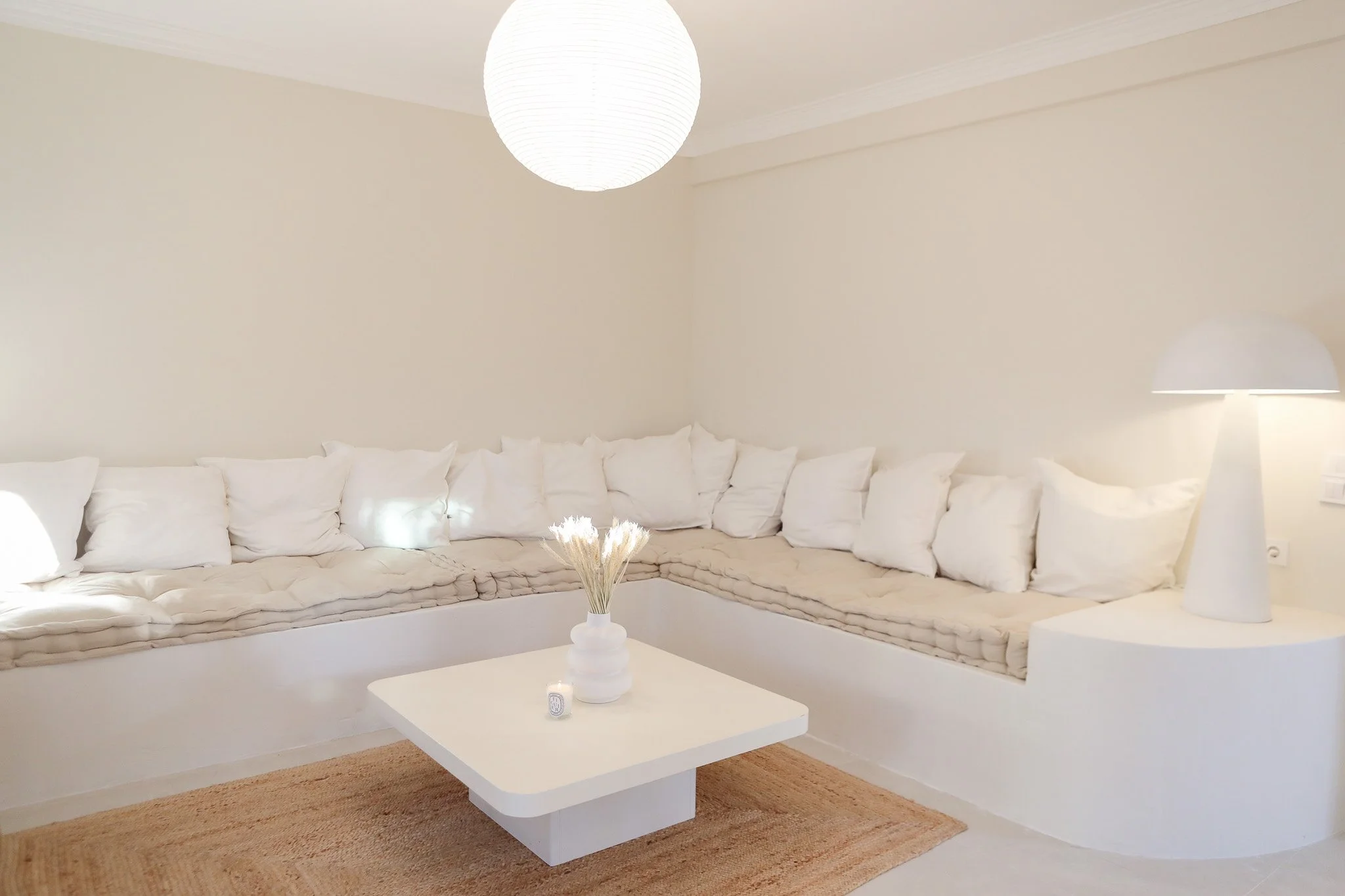 Consultation on the renovation of a holiday villa in the Atlantic coastal town of Aroeira, Portugal. This villa was designed with calmness and tactility in mind. Curved shapes and a muted colour scheme create a backdrop for a serene and calming retreat in a tranquil Portuguese Atlantic coastal town.